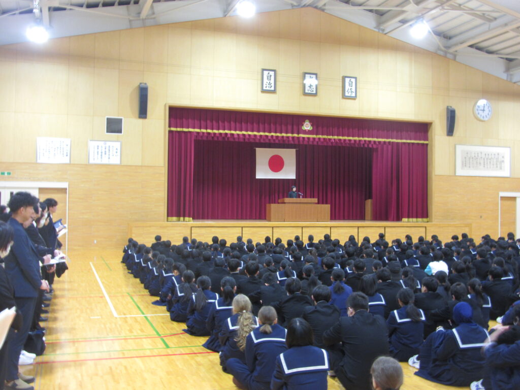 12月24日(水)、終業式が行われました。明日から14日間の冬休みに入ります。2学期は、いろいろな学校行事に目標を立てて取り組む姿がたくさんみられました。冬休みも自分の目標に向けて頑張る14日間に、そして言い訳や後回しをしない14日間にしてほしいと校長先生から話がありました。また生徒指導担当の先生から、自転車の乗り方等交通ルールやマナーを守って行動すること、SNSやネットでのトラブルに注意すること等、冬休み中の生活についての話もありました。