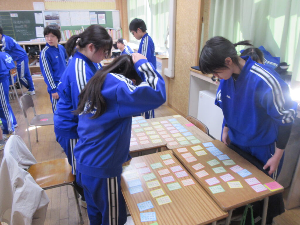 2年生の理科では、日本赤十字社が公開している「みんなで分けよう」を実施しました。呉羽山断層で地震が発生して避難所に避難したという設定で、それぞれが持っている食糧の分け方を考えました。アレルギーをもつ人、体調が悪い人、英語しか話せない人等、様々な設定のもと、みんなから不満がでないようにするにはどうすればよいかを話し合いました。「風邪だからスポーツドリンクがよい」、「外国の人で米よりもパンの方が食べ慣れている」、「まずは小さい子がいる人から食べ物を渡そう」など、相手の立場になって考えることができました。
