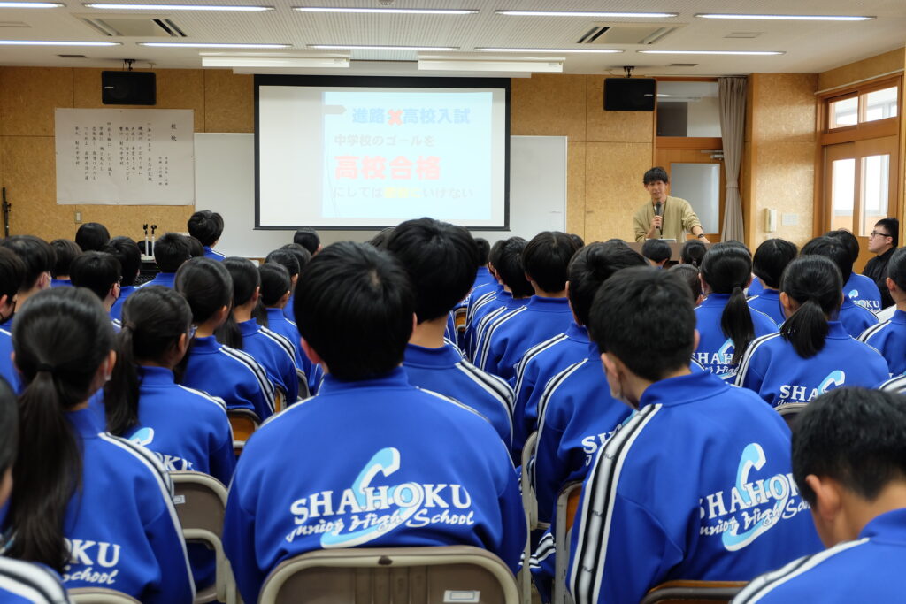 2学年では22日(水)5限に進路集会を行いました。学年主任から「進路学習とは幸せな人生について考えること」「高校進学のために今何をすべきか」等の話がありました。