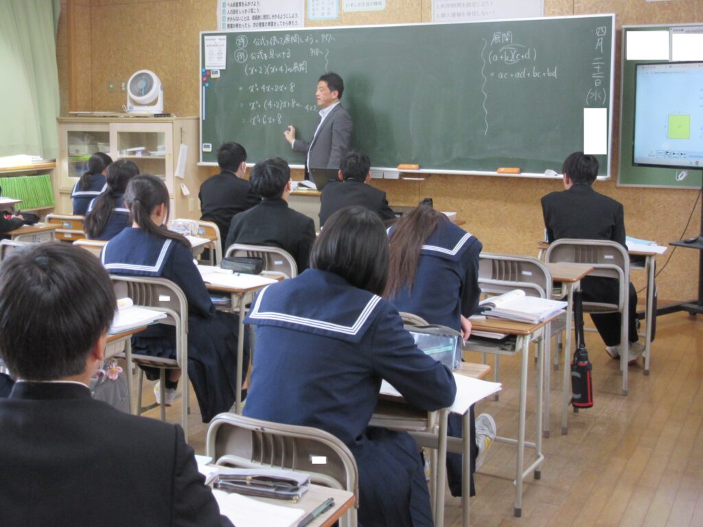 4月22日(水)の授業中の様子です。体育の授業では、スポーツテストとして50m走を測定しました。社会では、風刺画を見ながら歴史の勉強をしました。数学では、式の展開の公式を勉強しました。