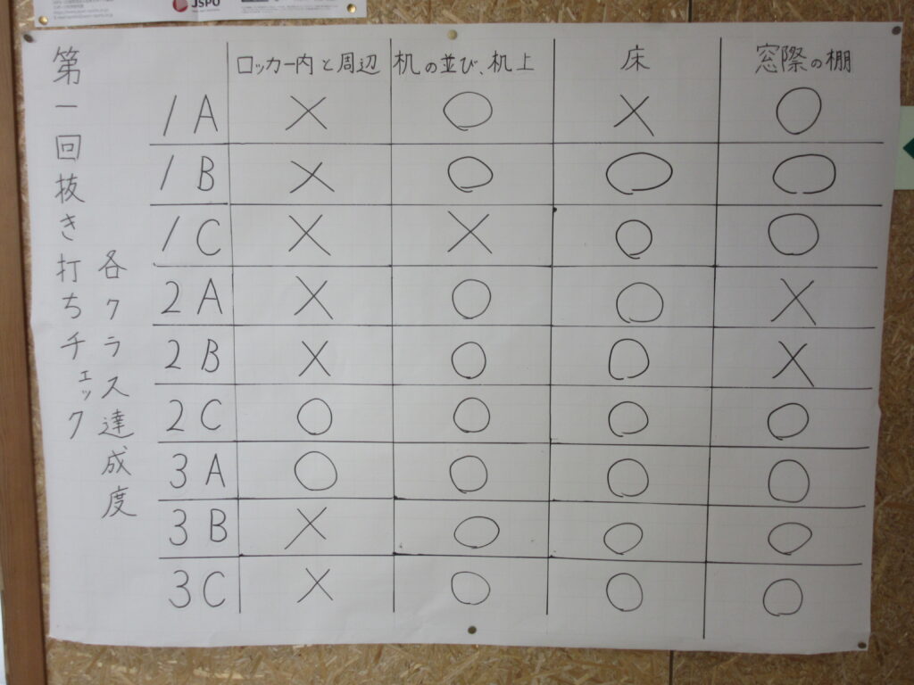 先日、整備委員会による教室環境の第1回抜き打ちチェックがありました。生徒玄関には、各クラスの結果が掲示されています。これから年度末に向けて、✕だったところを中心に教室を整えていきましょう。