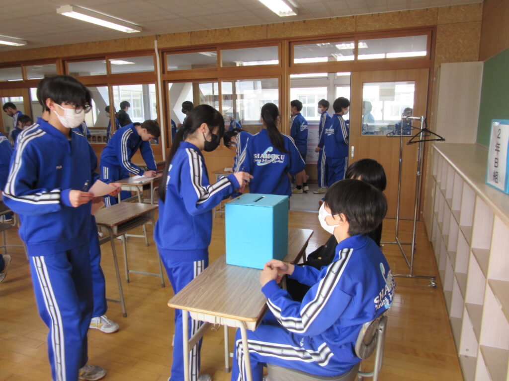3月5日(木)、前期生徒会選挙がありました。立候補者が公約や意気込みを発表した後に、投票を行いました。立候補者の話を真剣に聞き、自分の一票に責任をもって投票しました。