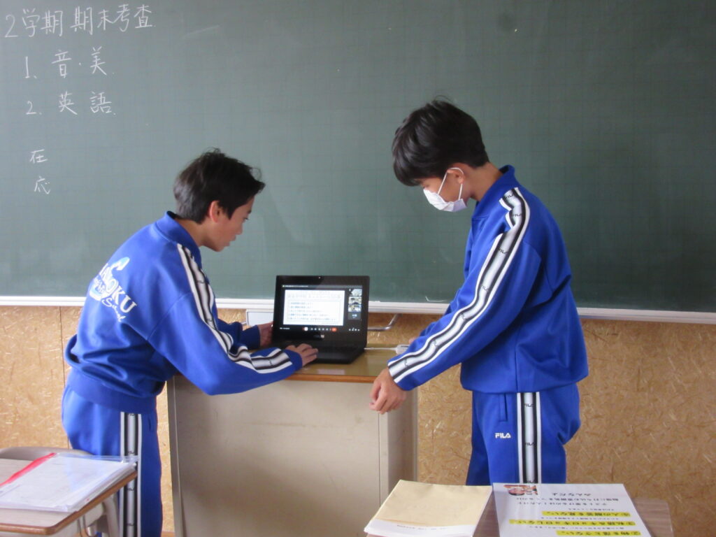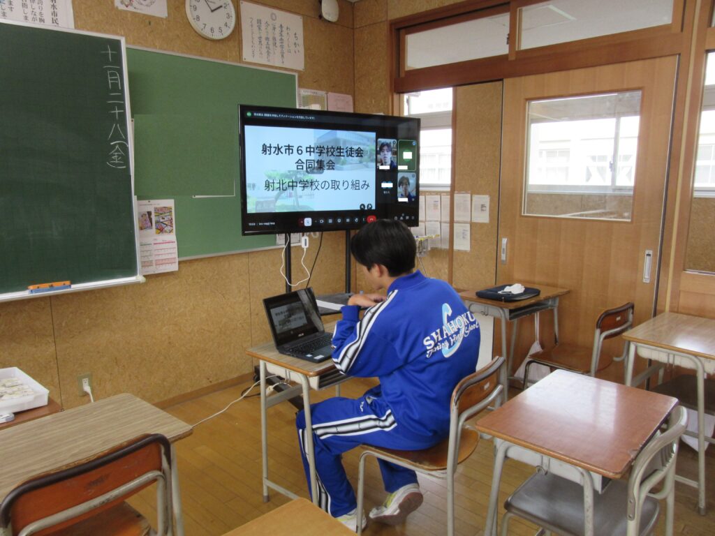 12月2日(火)に、市内6校の中学校がオンラインでつながる交流会が予定されています。その交流会に向けて、11月27日(木)放課後、生徒会執行部の生徒は、オンラインの接続を確認した後に、リハーサルを行いました。本番に向けて、準備は万全です。