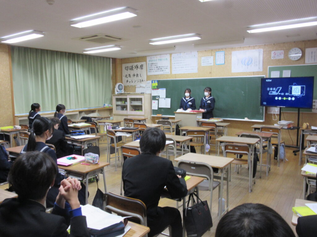 2年生は、来週行われる14歳の挑戦の発表会に向けて、リハーサルを行いました。最初から通して、流れを確認しました。道具を使って実演したり、寸劇したりする班もあります。本番は1年生も聞きに来るので、真剣にリハーサルに取り組んでいました。
