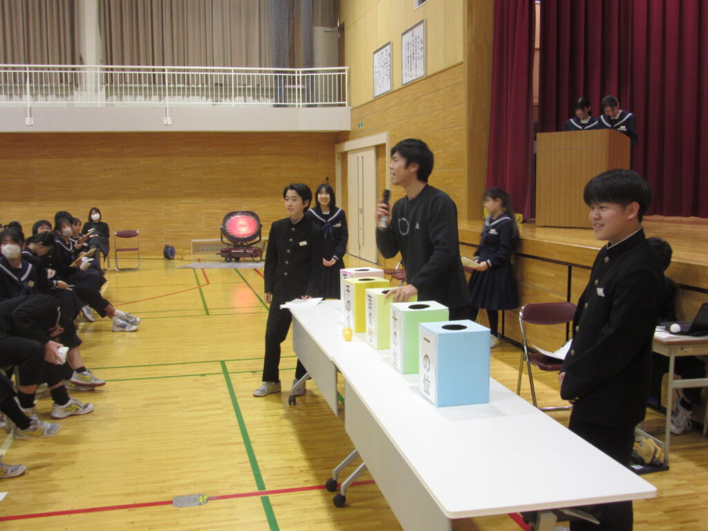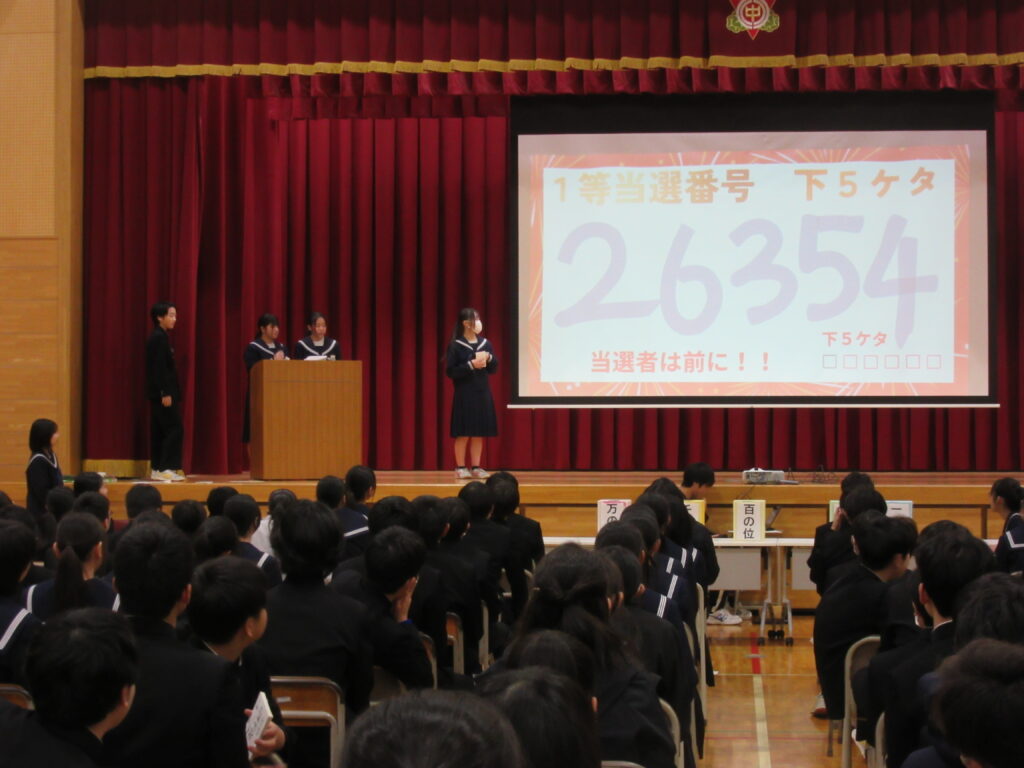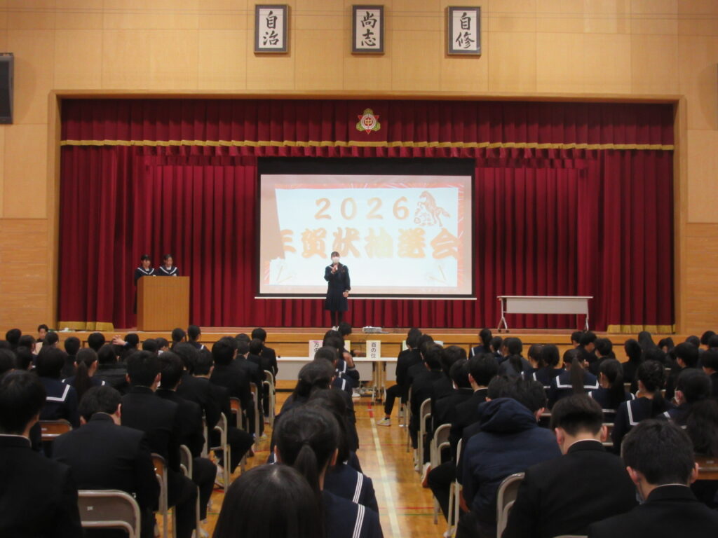 校内年賀状抽選会 投稿日時: 2026年1月19日 投稿者: admin 1月16日(金)、生徒会が主催の校内年賀状抽選会が行われました。番号が発表されるたびに、当選していないか自分が持っている年賀状の番号と見比べていました。とても盛り上がりました。