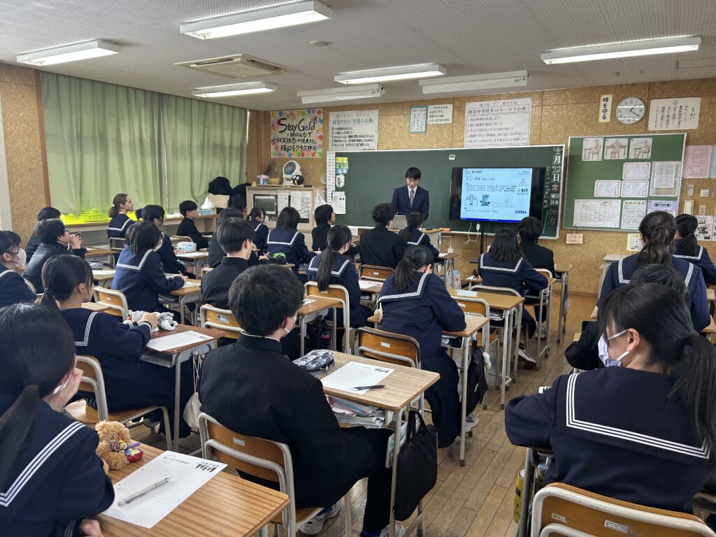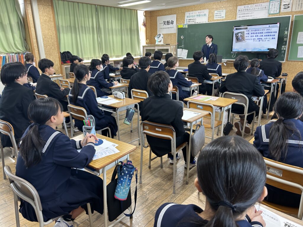 22日(木)5、6限に「働く人に学ぶ講演会」を開催しました。A組はあいの風とやま指令所、B組はコーセル(株)、C組はシロウマサイエンス(株)の方々にご講演いただきました。仕事内容から中学生の時期に身に付けておきたいことまでたくさんの内容を話していただきました。どの学級でもたくさん質問の手が上がり、意欲的に参加していました。