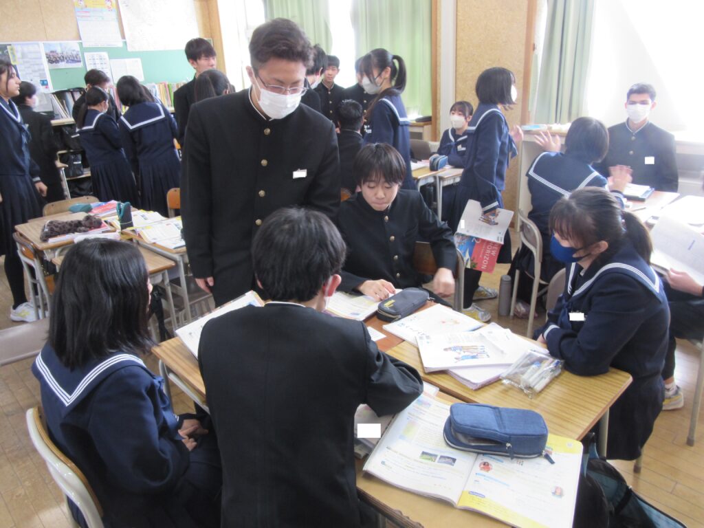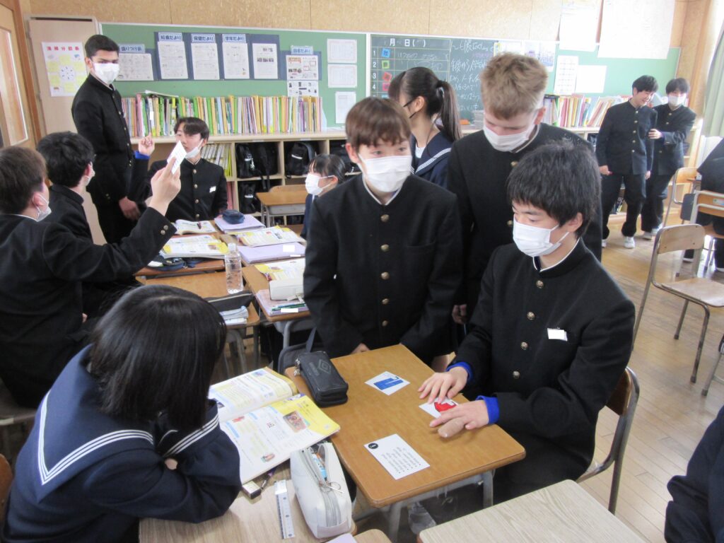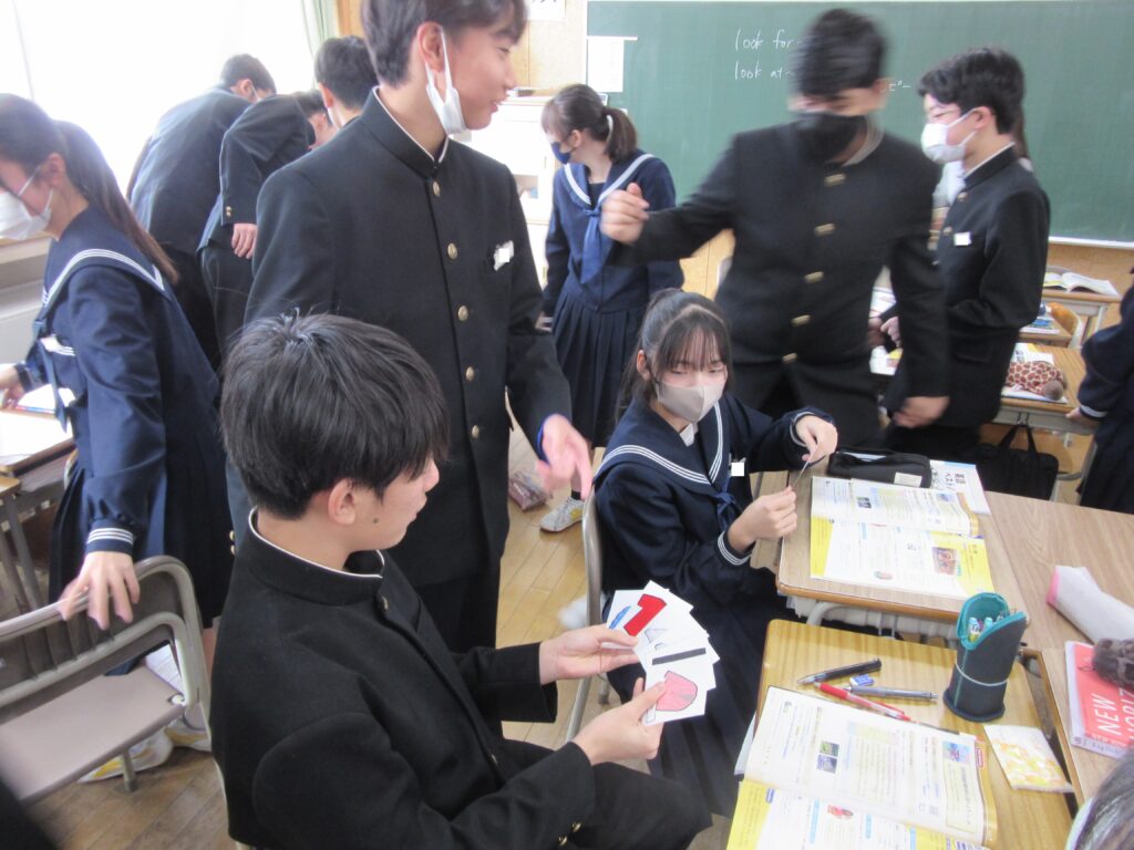 2年生の英語では、ALTの先生と一緒に買い物をするときに使う表現を、ゲームを通して勉強しています。服や靴のイラストが描かれたカードを使って、「May I help you?」や「I’m looking for ~」の練習をしました。楽しく英語を学んでいます。