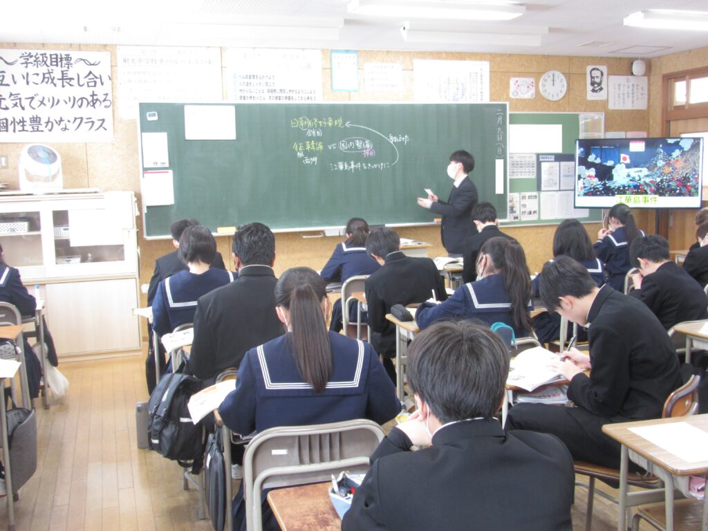 2年生 社会(近代日本の歩み) 投稿日時: 2026年2月10日 投稿者: admin 2年生の社会では、明治維新の後の「近代日本の歩み」を学習しています。今日は、「日朝修好条規」や「江華島事件」について、スライドの資料を見ながら勉強しました。