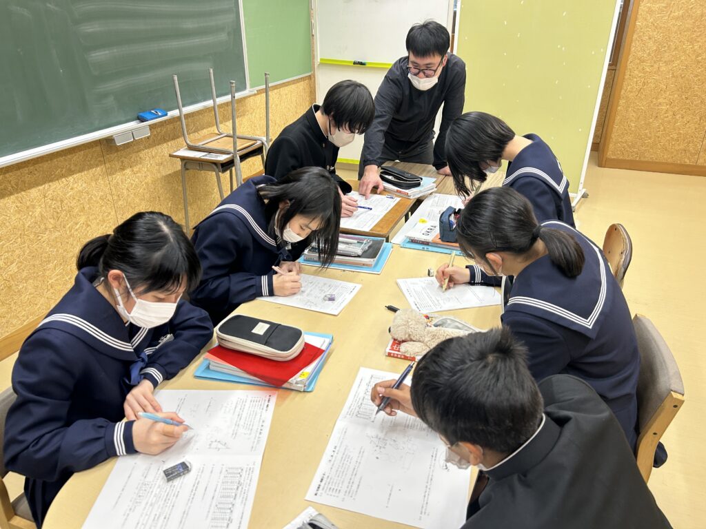 今回は学年末ということで、拡大版とし、国語は万葉コースと徒然コース、数学は難易度に応じて3コース、英語も文法コースと英作文コースの2コースに分けて授業を行いました。校長先生も自らチョークを握り、熱血指導!生徒たちは積極的に質問したり、教え合ったりしていました。