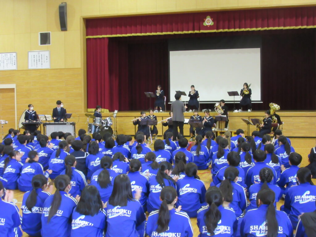 卒業生を送る会 投稿日時: 2026年3月10日 投稿者: admin 3月10日(火)、生徒会が主催となり、「卒業生を送る会」が行われました。先生にちなんだクイズや1年を振り返る動画、吹奏楽部の演奏等がありました。短い時間でしたが、全校生徒で楽しい時間を過ごすことができました。
