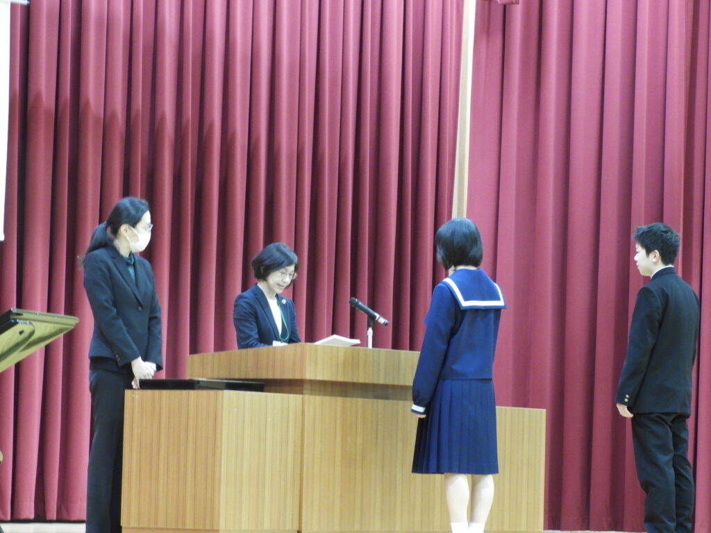 3月24日(火)、修了式があり、校長先生から代表生徒に修了証が手渡されました。春休みに向けて、安全に気を付けて命を守る行動をとること、SNS等で時間を無駄にせずに時間を大切に使うことについて、校長先生からお話がありました。