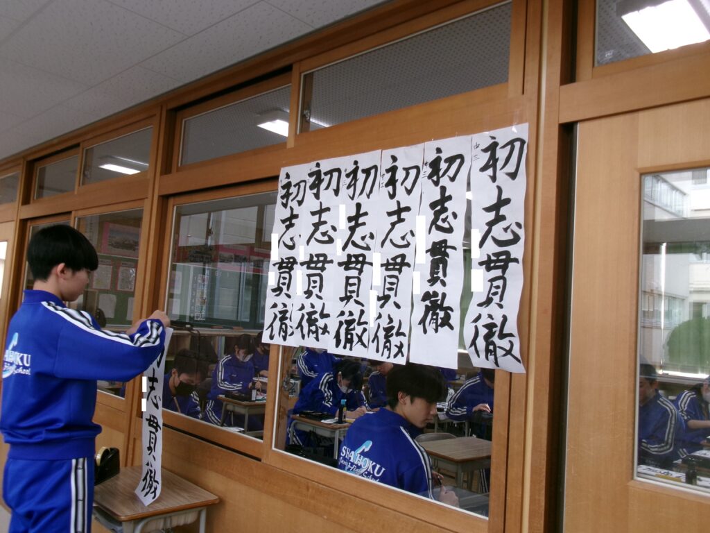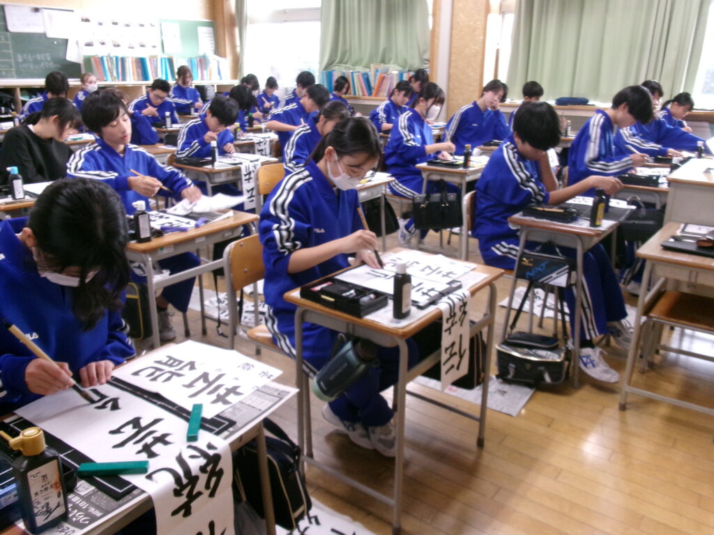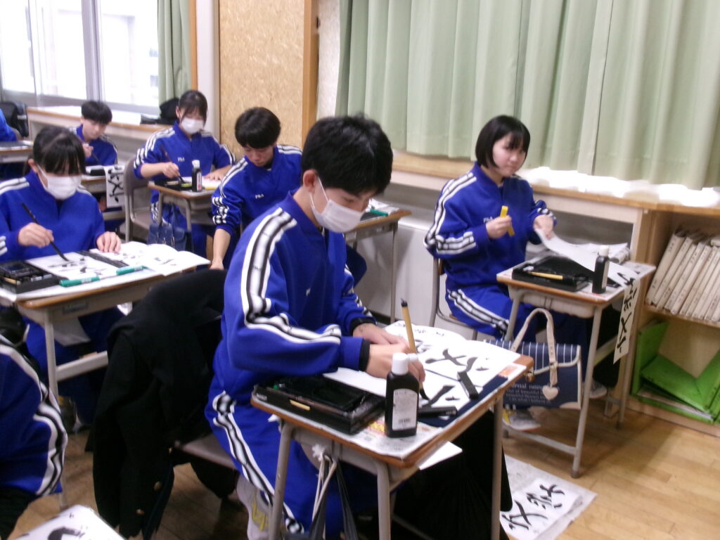 12月16日(火)、書初練習を行いました。今年のテーマは、1年生が「伝統芸能」、2年生が「文学の地」、3年生が「初志貫徹」です。完成した作品は、廊下に掲示されています。