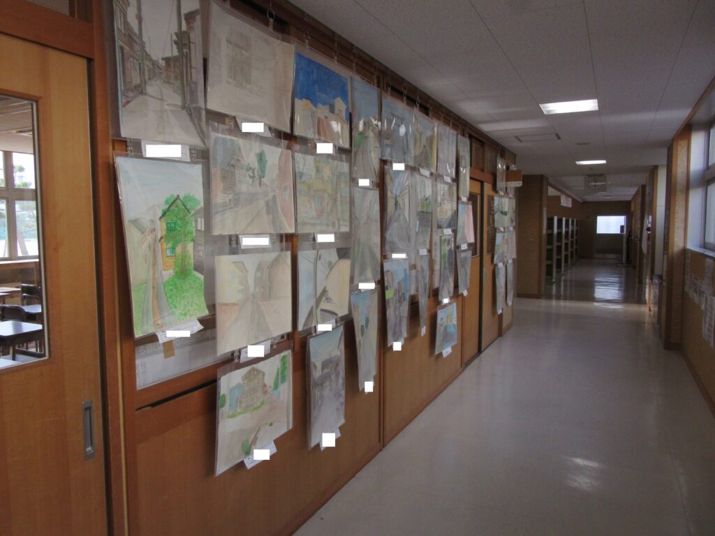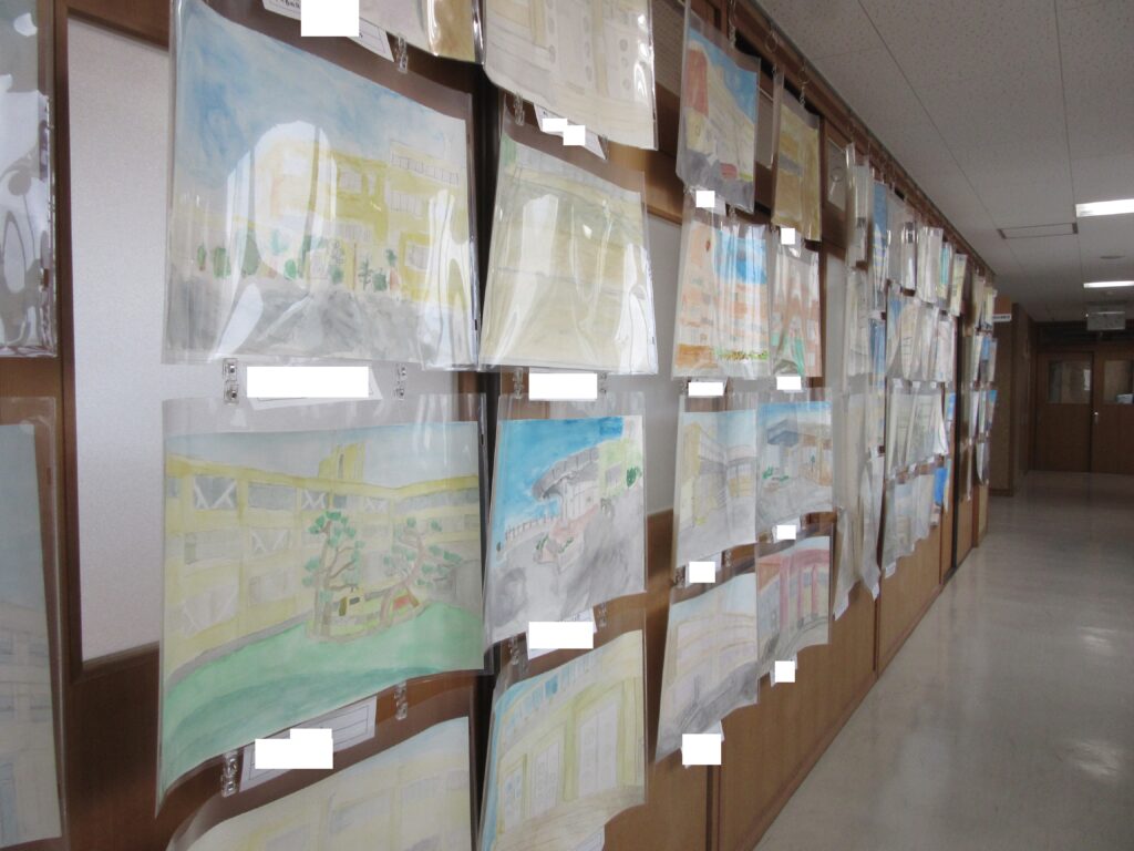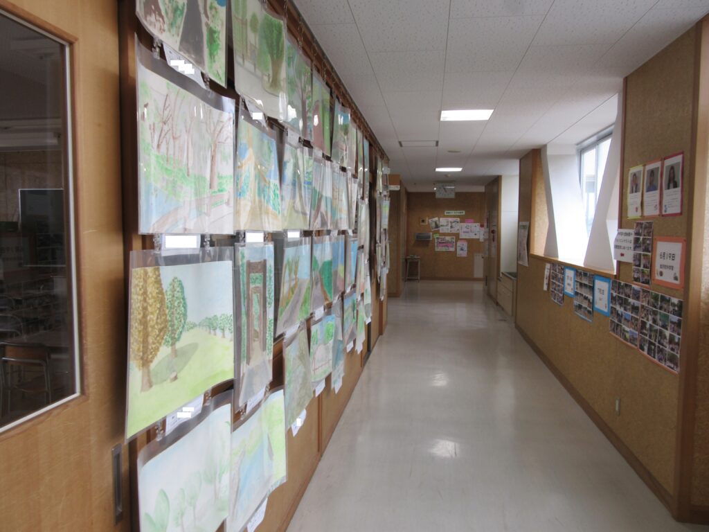 各学年の廊下には、10月に行われた写生大会の作品が展示されています。1年生は校舎まわり、2年生は足洗潟公園、3年生は堀岡地区で描きました。保護者会で来校された際には、ぜひご覧ください。