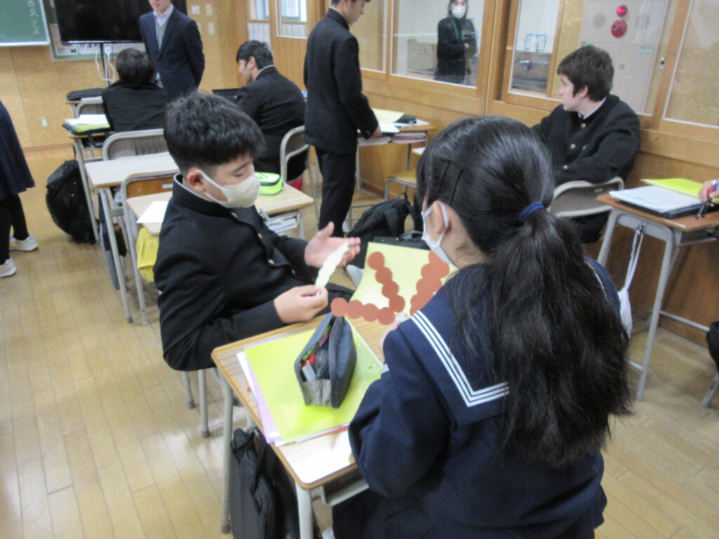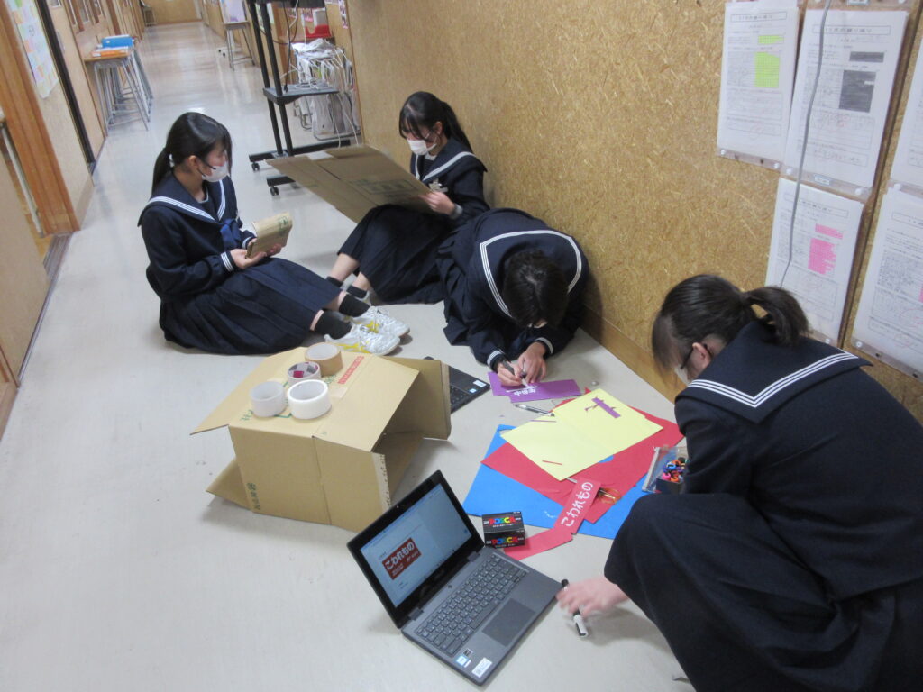 12月23日(火)に予定されている14歳の挑戦発表会に向けて、2年生は発表準備を頑張っています。寸劇や実演を必ず入れることになっています。今日は、発表に使う小道具を作っている班もありました。