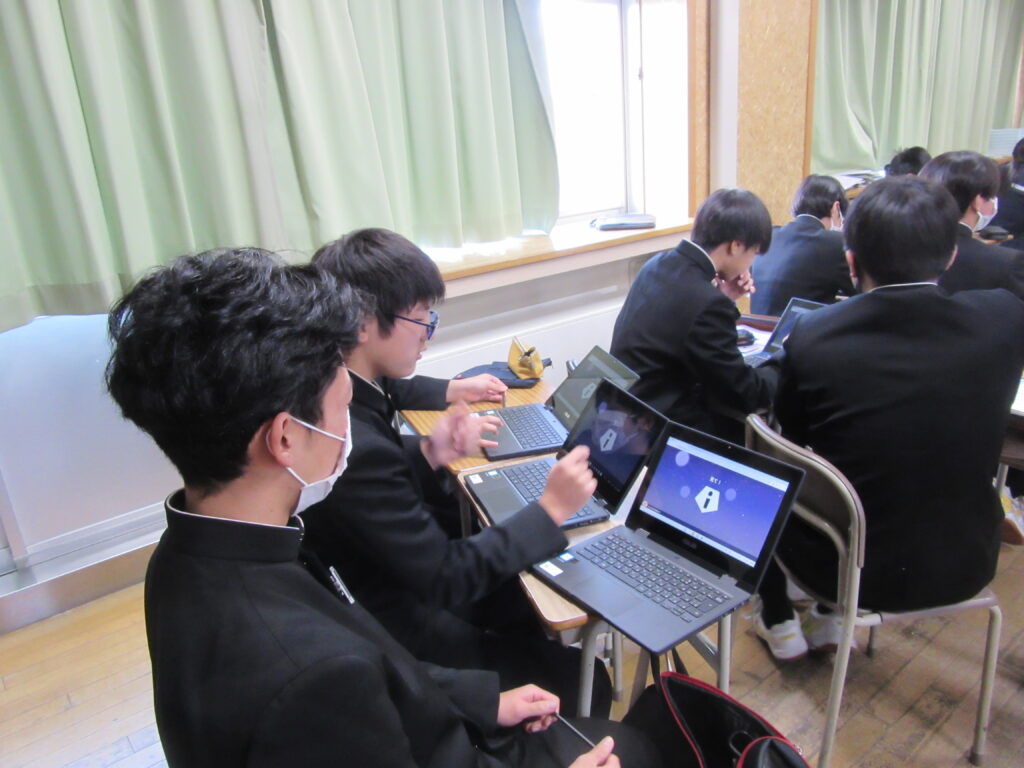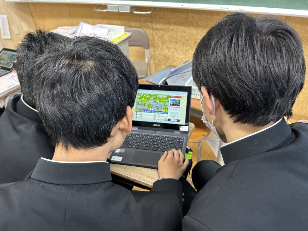 12月1日(月)、2年生の理科の授業で防災レクリエーションを行いました。架空の町で、南海トラフの地震が発生したという想定で行いました。各自がもっている情報を地図上に書き込み、消火や救助活動の指示を出しました。津波が迫る中、行動の優先順位をつけて考えることができました。