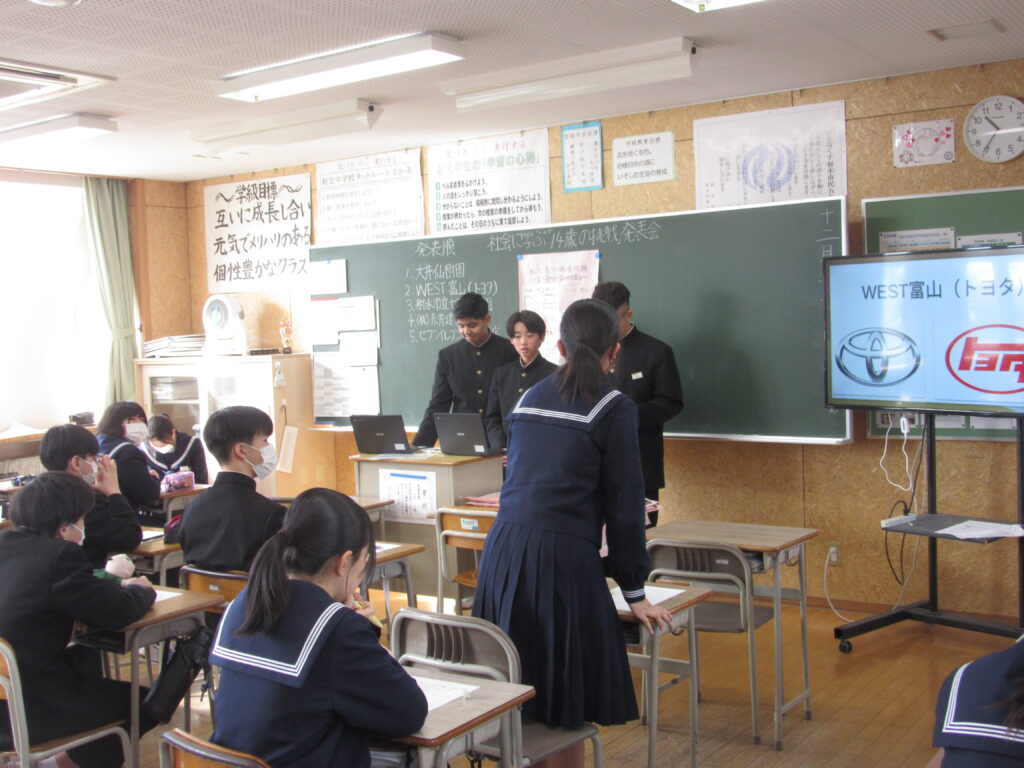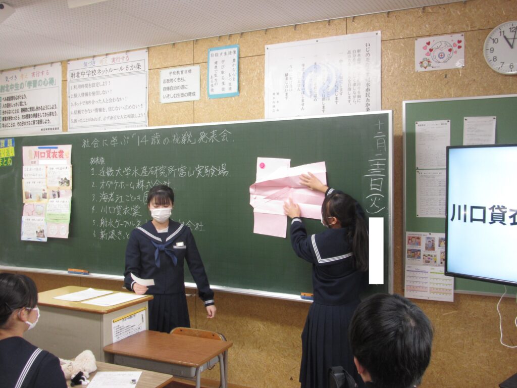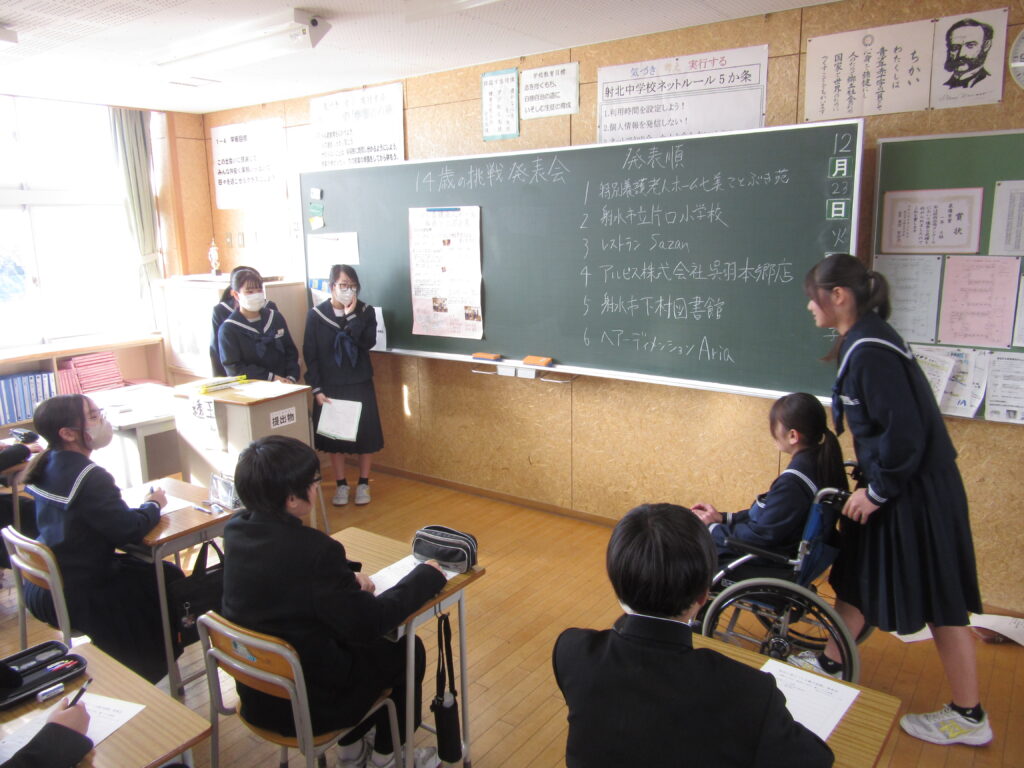 2年生は、来週行われる14歳の挑戦の発表会に向けて、リハーサルを行いました。最初から通して、流れを確認しました。道具を使って実演したり、寸劇したりする班もあります。本番は1年生も聞きに来るので、真剣にリハーサルに取り組んでいました。