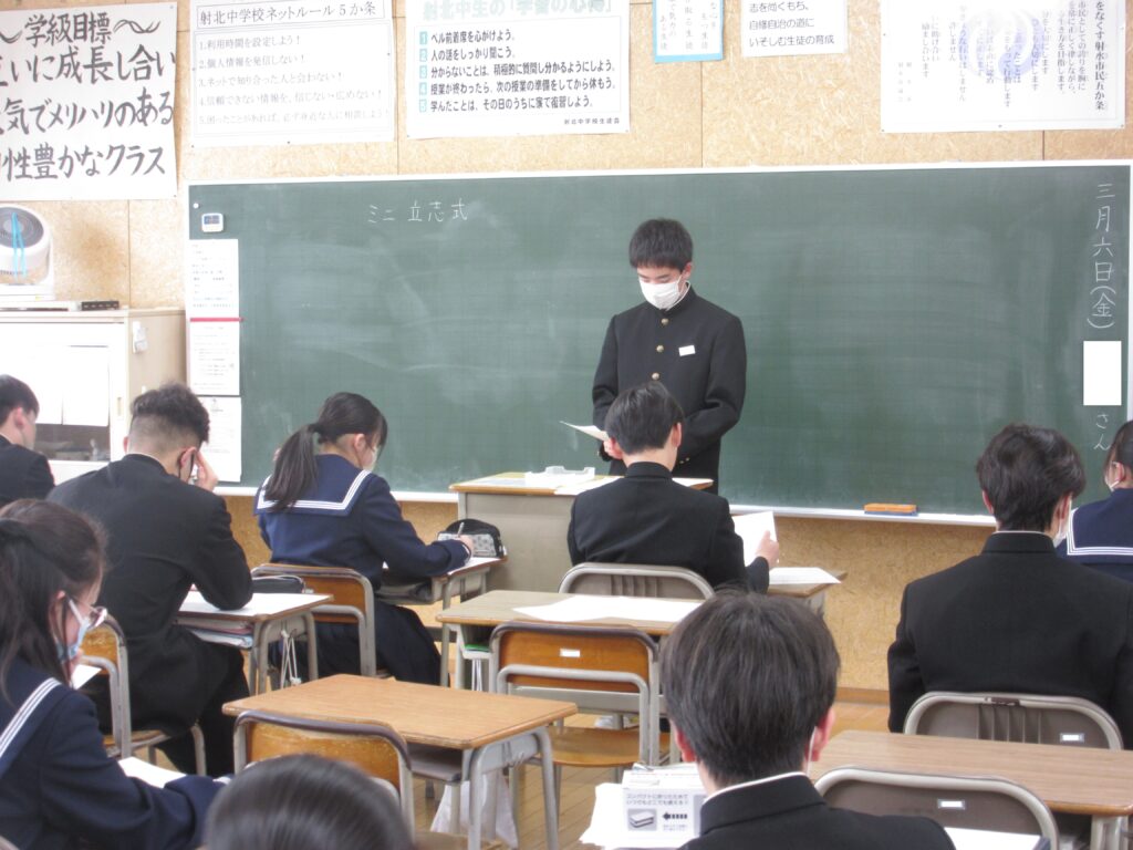 3月3日(火)、生徒会選挙の立候補者は、給食の時間に各クラスを回って公約や意気込みを発表しています。立候補者の話を真剣に聞いています。立ち会い演説会と選挙は、明後日5日(木)に行われます。